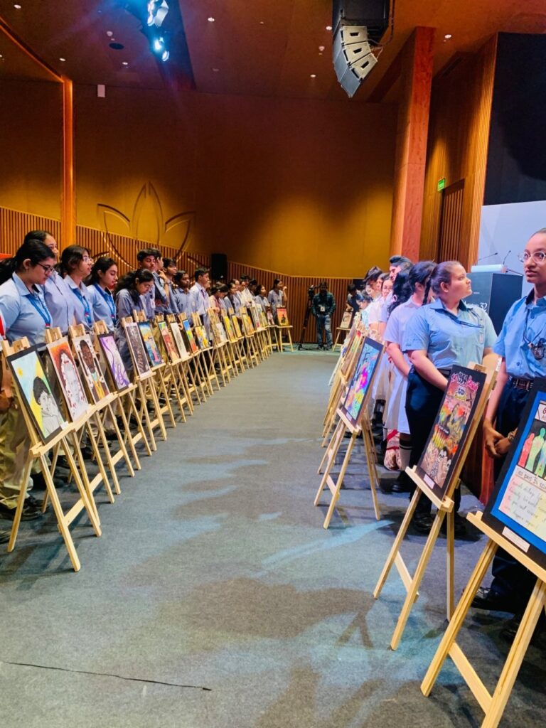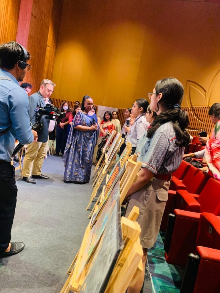 Abayobozi barimo Ambasaderi w’u Rwanda mu Buhinde Mukangira Jacqueline, Umuyobozi w’Ishami rya Loni mu Buhinde, Darrin Farrant n’abarimu babanje kwerekwa no gusobanurirwa ubutumwa bukubiye muri ibyo bihangano.