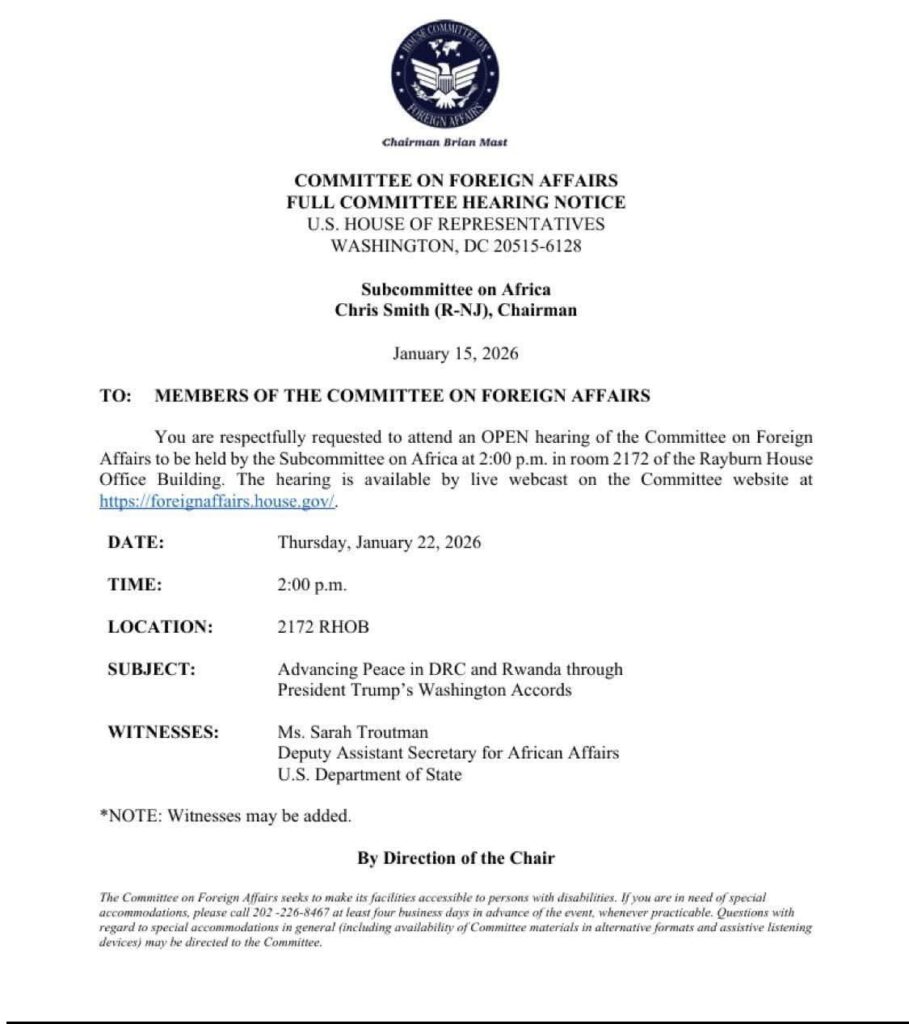 Nk’uko bigaragara muri iri tangazo, iyi nama izaba ifunguye ku mugaragaro kandi izatambutswa imbona nkubone (live webcast) ku rubuga rwa Komite ishinzwe Ububanyi n’Amahanga y’Amerika.