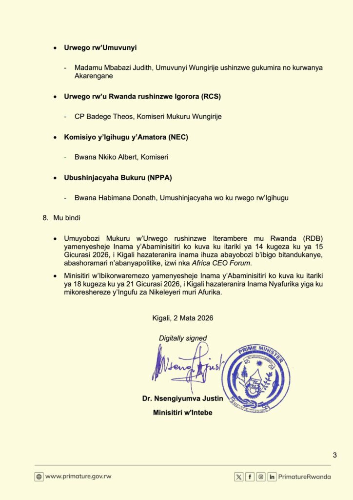 Ibyemezo by’Inama y’Abaminisitiri yateranye ku wa 2 Mata 2026 yari iyobowe na Perezida Paul Kagame yashyize mu myanya abarimo CP Theos Badege wagizwe Komiseri Mukuru Wungirije w’Urwego rw’Igihugu rushinzwe Igorora RCS (Rwanda Correctional Service).