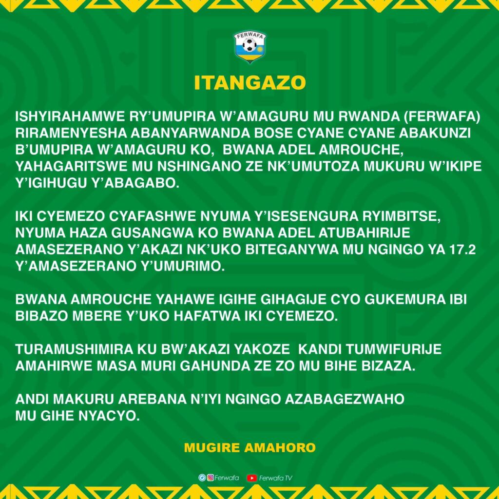 Ishyirahamwe ry’Umupira w’Amaguru mu Rwanda (FERWAFA) ryatangaje ko ryahagaritse amasezerano ryari rifitanye n’umutoza mukuru w’Ikipe y’Igihugu y’abagabo, Amavubi, Bwana Adel Amrouche, nyuma y’isesengura ryimbitse ku mikorere n’umusaruro w’iyi kipe.
