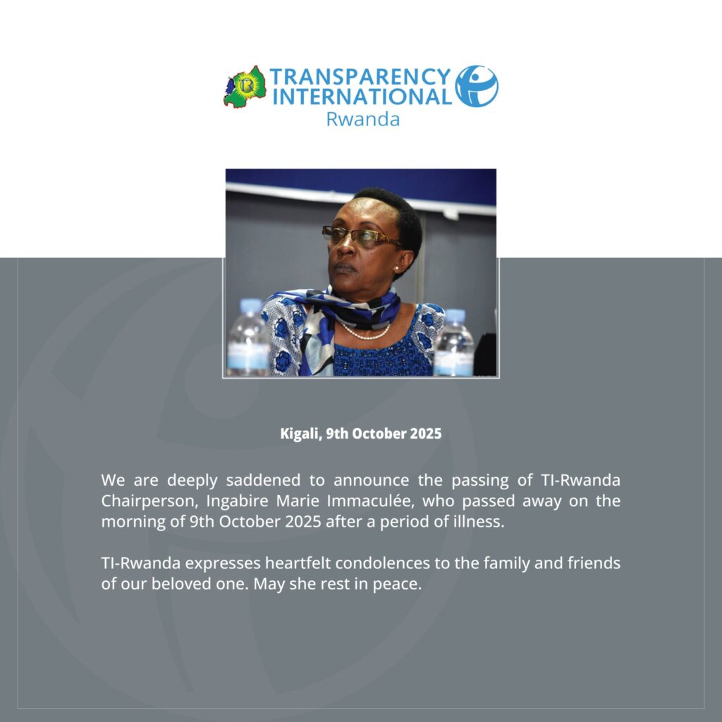 Yanditse iti: ”Tubabajwe cyane no gutangaza urupfu rw’umuyobozi wa Transparency International Rwanda, Ingabire Marie Immaculée, witabye Imana mu gitondo cyo ku ya 9 Ukwakira 2025 azize uburwayi. Transparency International Rwanda irihanganisha umuryango n’inshuti. Aruhukire mu mahoro”.