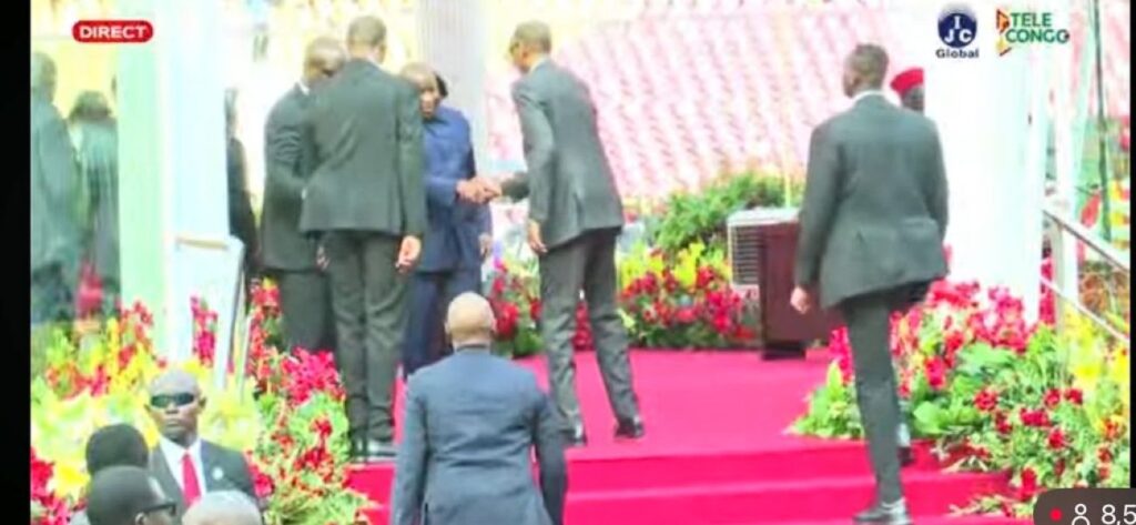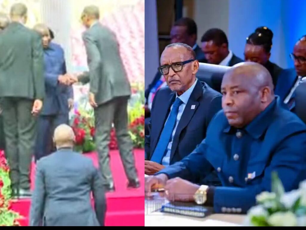 Igihe Perezida Paul Kagame yageraga muri Kintélé Stadium yagaragaye mu mashusho yanyuraga kuri Televiziyo y’Igihugu aho yageze aho ahura na Perezida Ndayishimiye w’u Burundi bararamukanya.