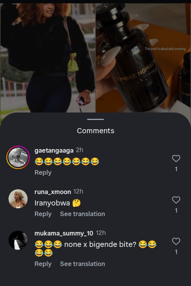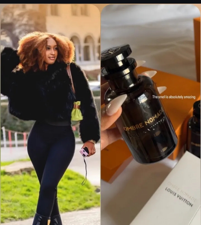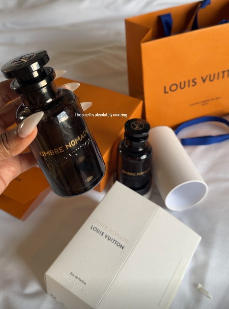 Muri ayo mafoto Muyango yakomeje yerekana ko yiguriye umubavu witwa Ombre Nomade Eau de Parfum ukorwa n’uruganda rwa Louis Vuitton.