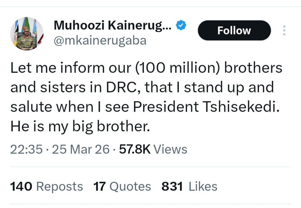 Mu butumwa yashyize ku rubuga rwa X (rwahoze ari Twitter), Muhoozi yabwiye Abanye-Congo bose, bagera kuri miliyoni 100, ko afata Tshisekedi nka mukuru we kandi amuha icyubahiro gikomeye.
