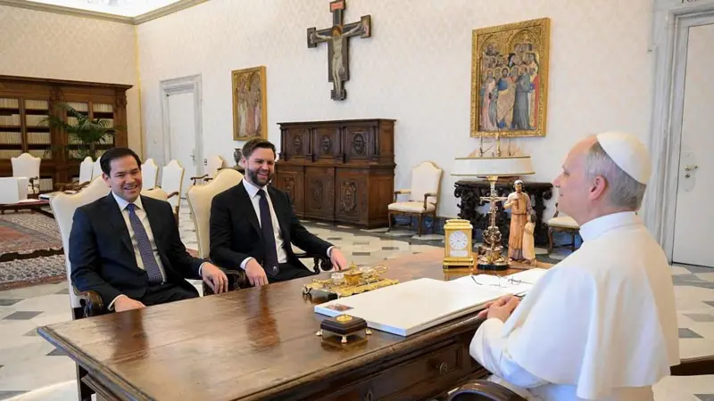 Muri Gicurasi uyu mwaka, Papa Léon yahuye n’Abanyagatolika bo mu butegetsi bwa Trump, ari bo Visi Perezida JD Vance (imbere iburyo) na Minisitiri w’ububanyi n’amahanga Marco Rubio