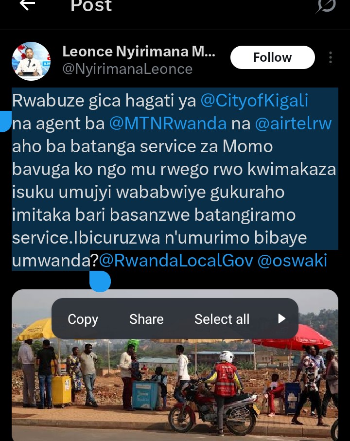 Mu butumwa yanditse bugira buti “Rwabuze gica hagati ya CityofKigali na agent ba MTNRwanda na airtelrw aho ba batanga service za Momo bavuga ko ngo mu rwego rwo kwimakaza isuku umujyi wababwiye gukuraho imitaka bari basanzwe batangiramo service.”